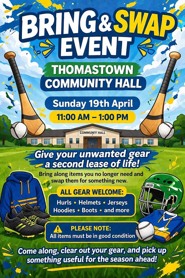 Bring along your unwanted gear and swap it for something useful for the season ahead. From hurls and helmets to jerseys, hoodies, and boots โ all gear is welcome!